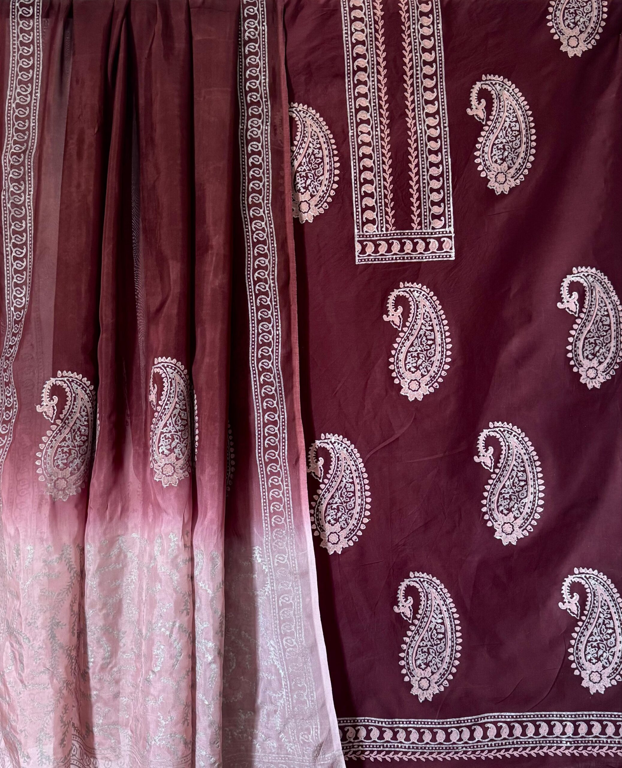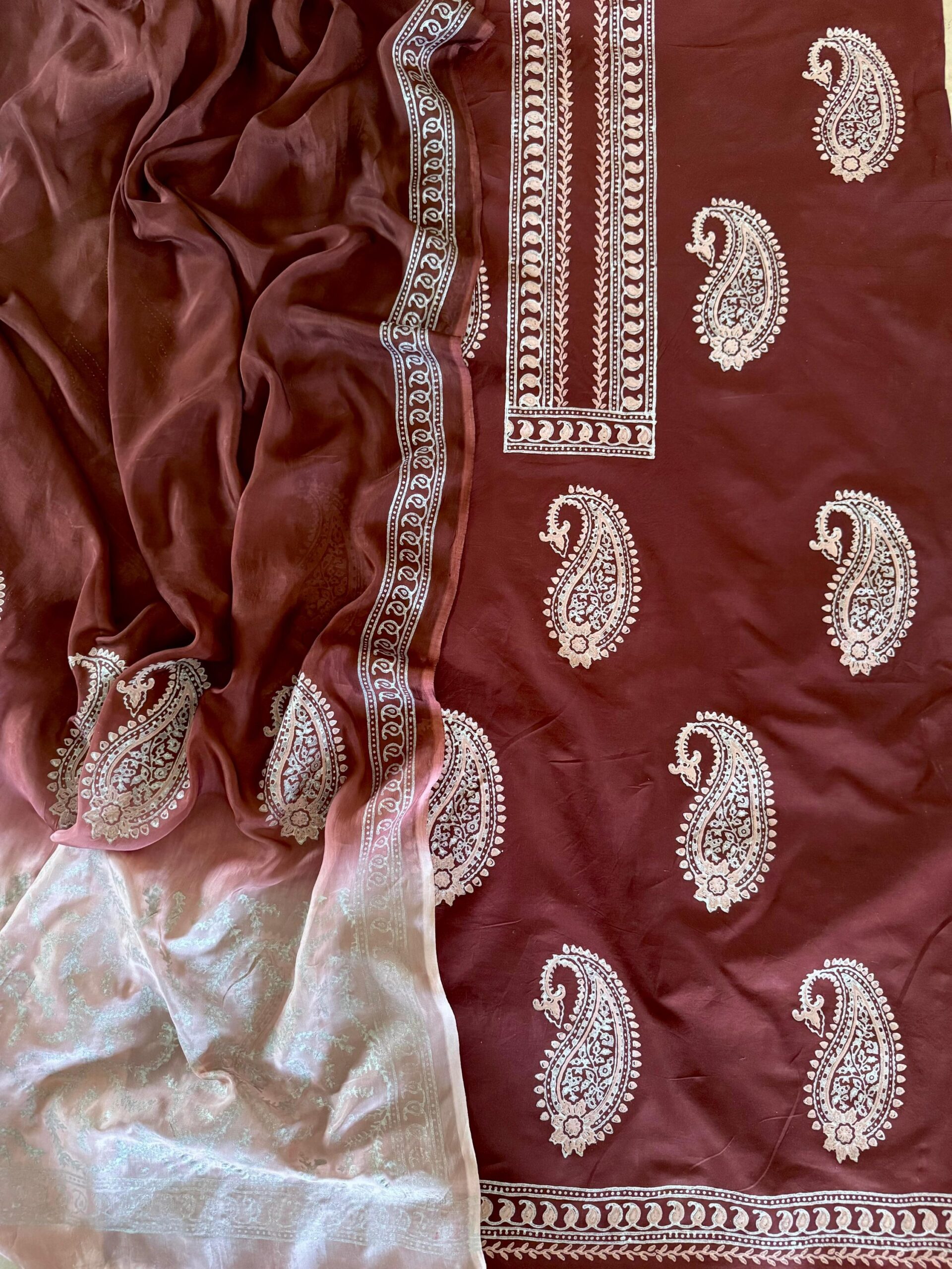 This coffee-toned lawn 3-piece is all about effortless cool with a hint of charm.The block-printed shirt brings those handcrafted, artsy vibes in a rich coffee hue, while the 2-toned dupatta blends coffee brown with soft light brown for that smooth, latte-like contrast. Finished with plain pants to keep it clean, effortless, and super wearable.