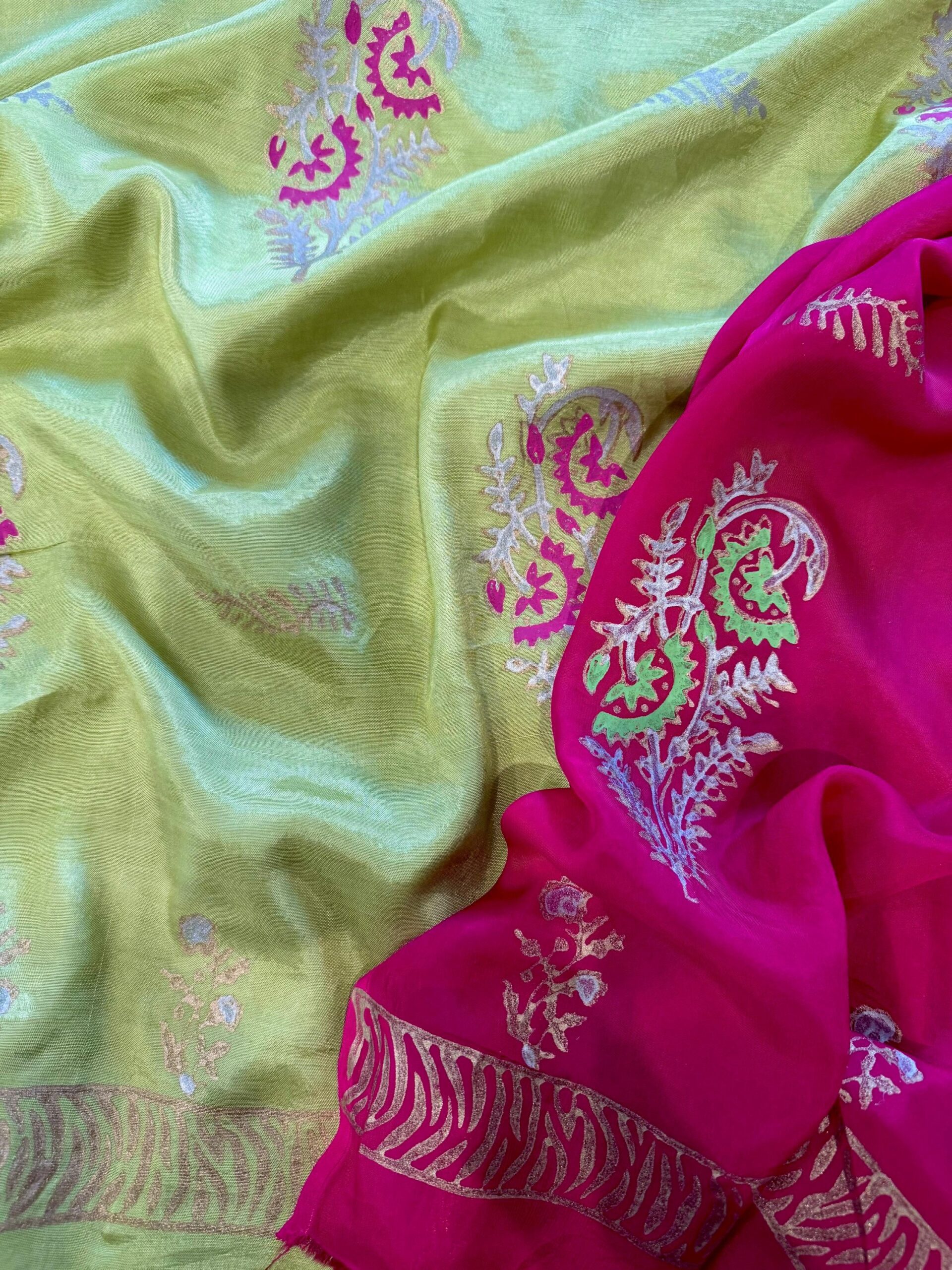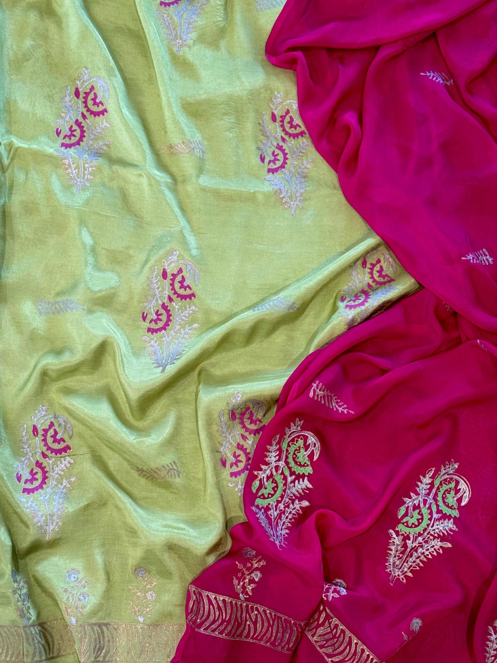 Product Details: Unstitched 3-piece set featuring a block-printed green shirt, plain pants, and a pink block-printed dupatta.