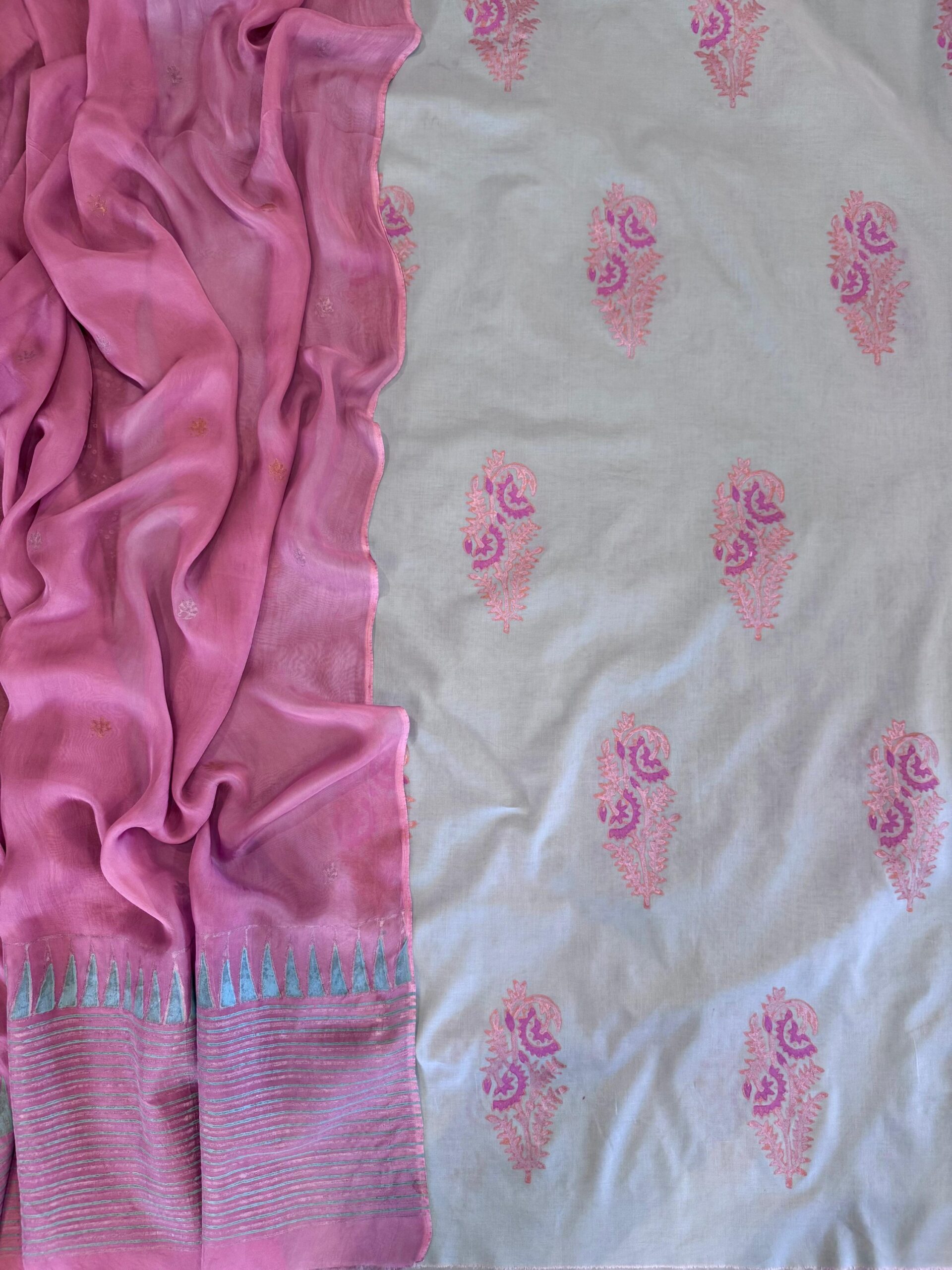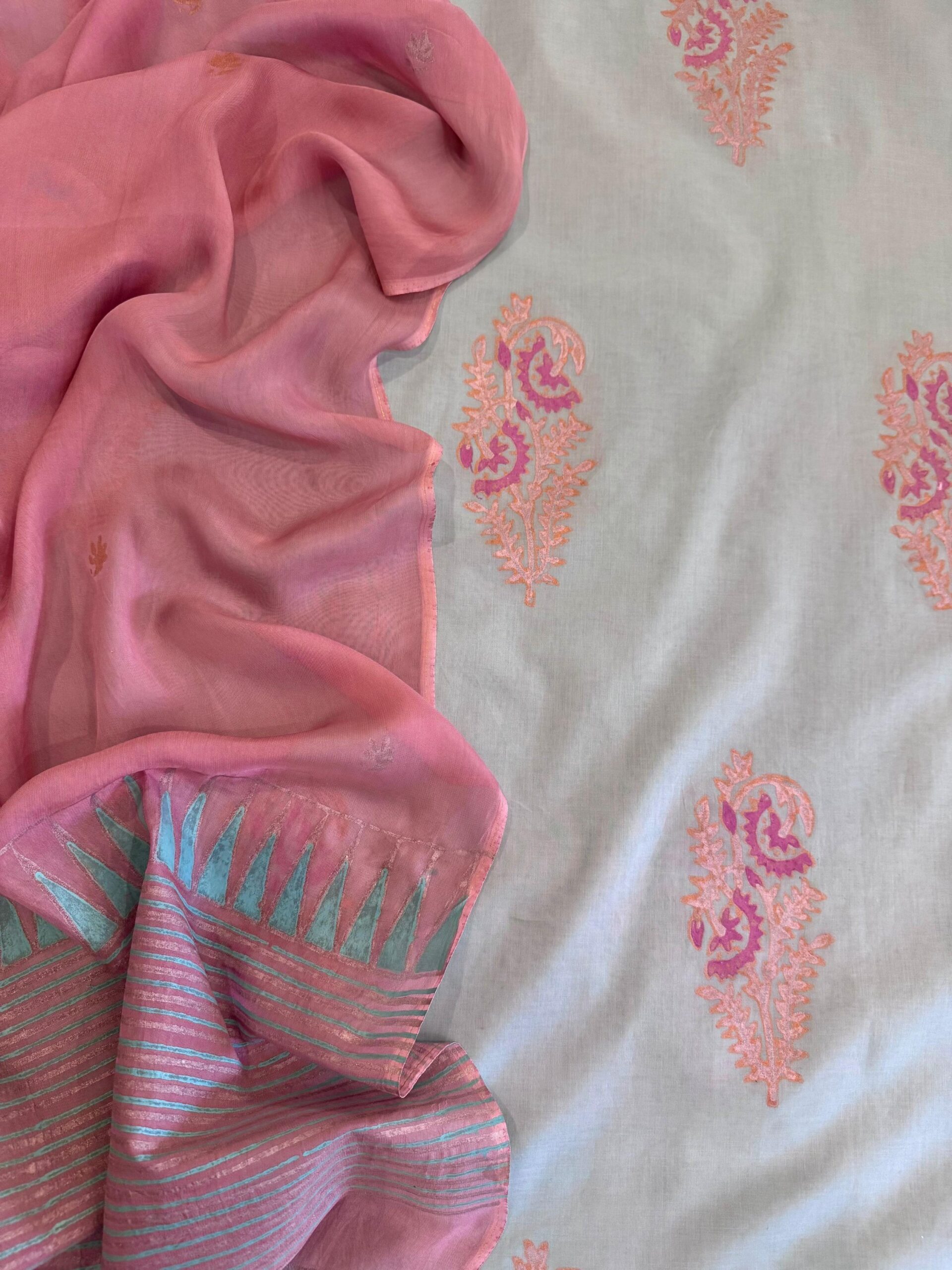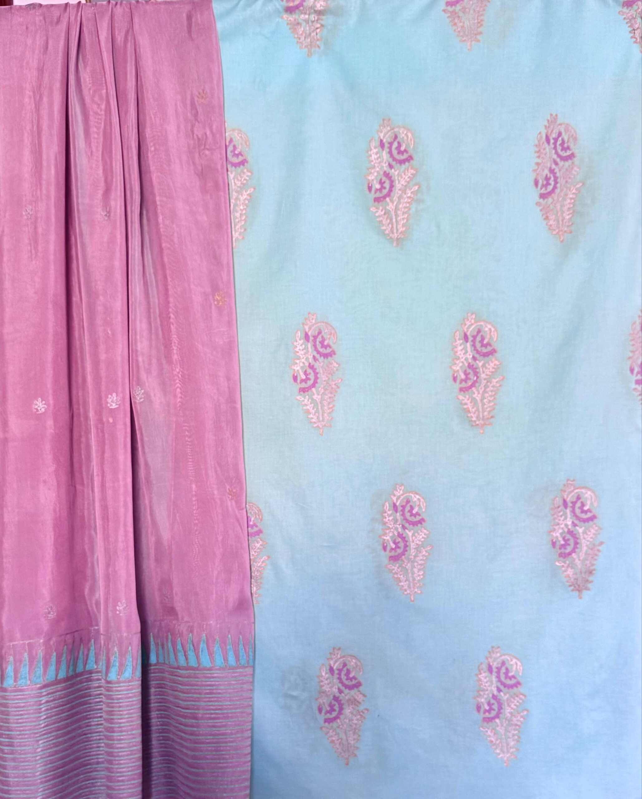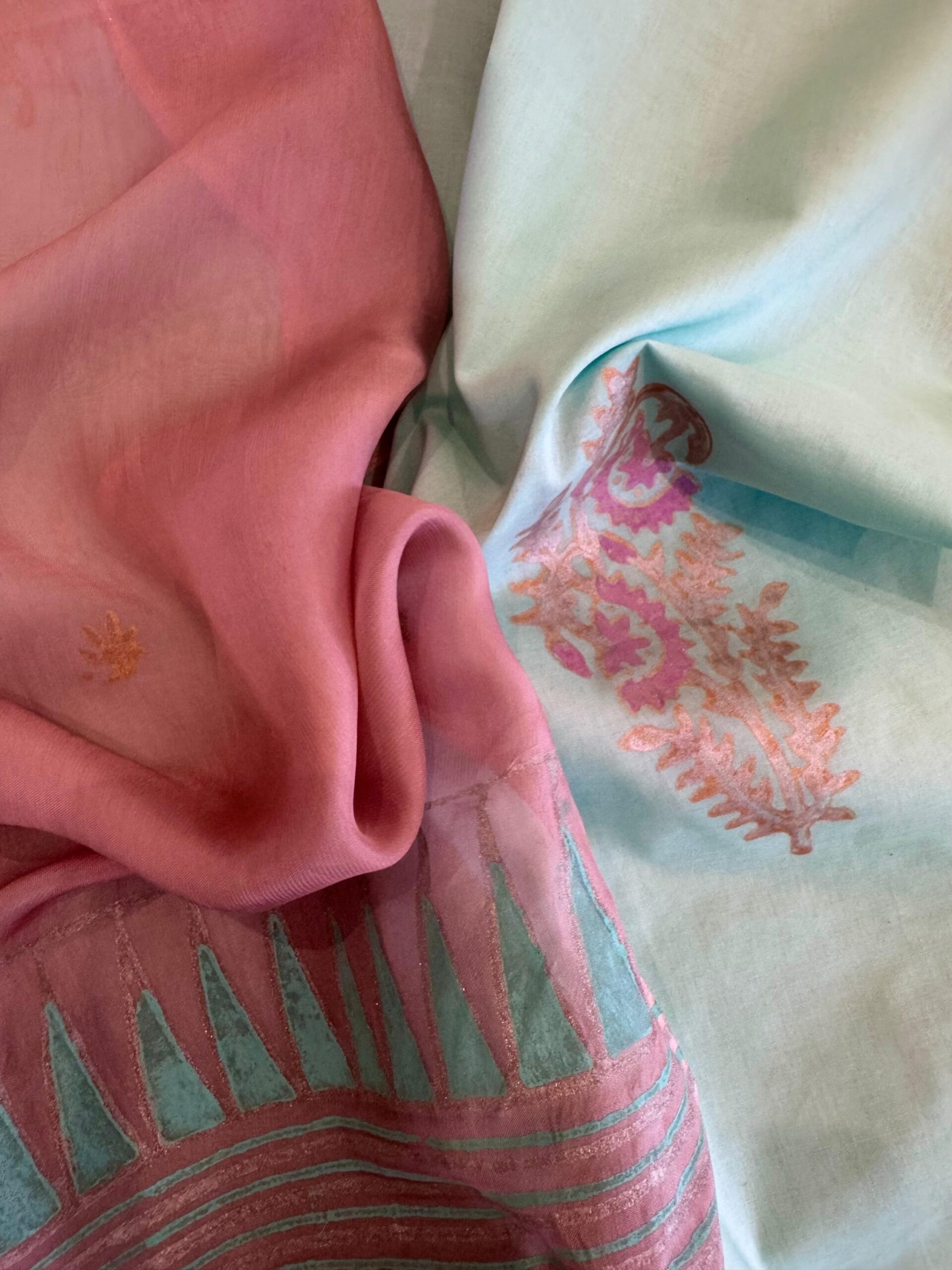 Whispering hues of light turquoise meet the gentle charm of tea pink. A hand block-printed shirt paired with a silk dupatta that moves with quiet elegance.