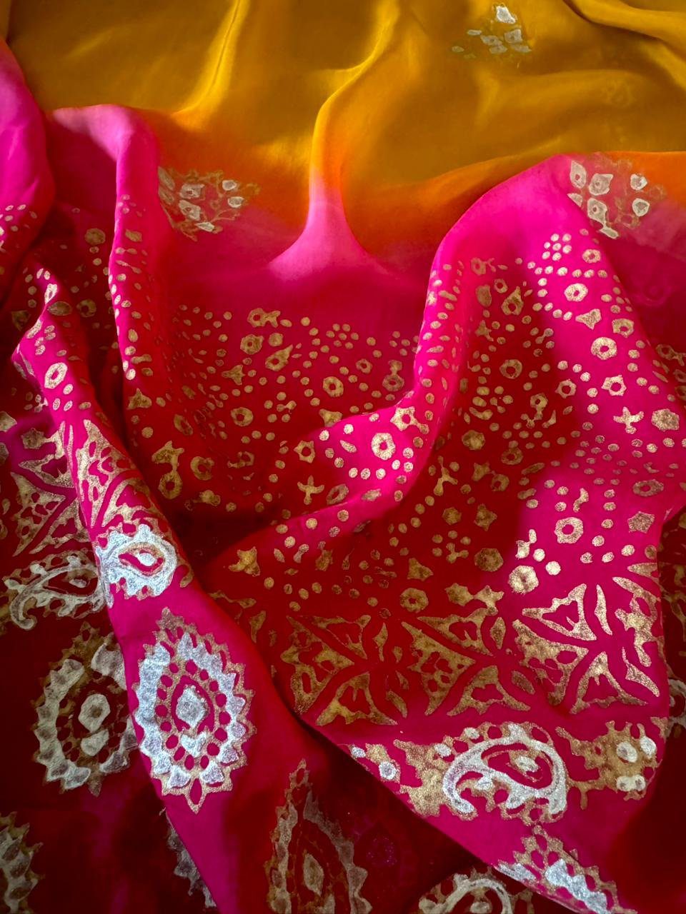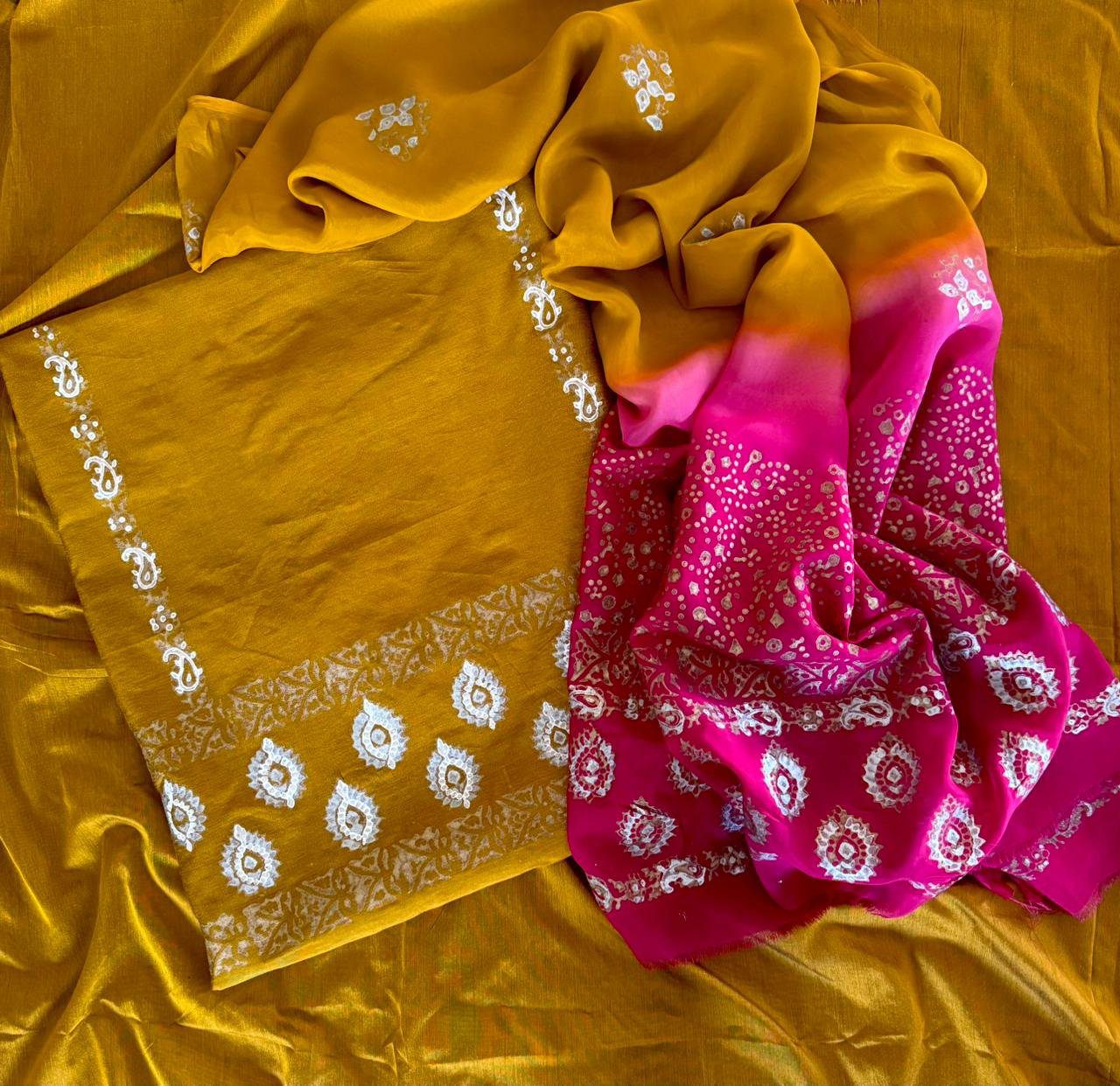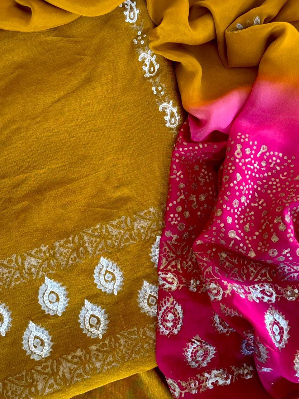 Bold, bright, and brimming with charm.This three-piece set pairs a sunshine block printed mustard shirt and 2 toned dupatta. A mood-lifting combo made to turn heads.