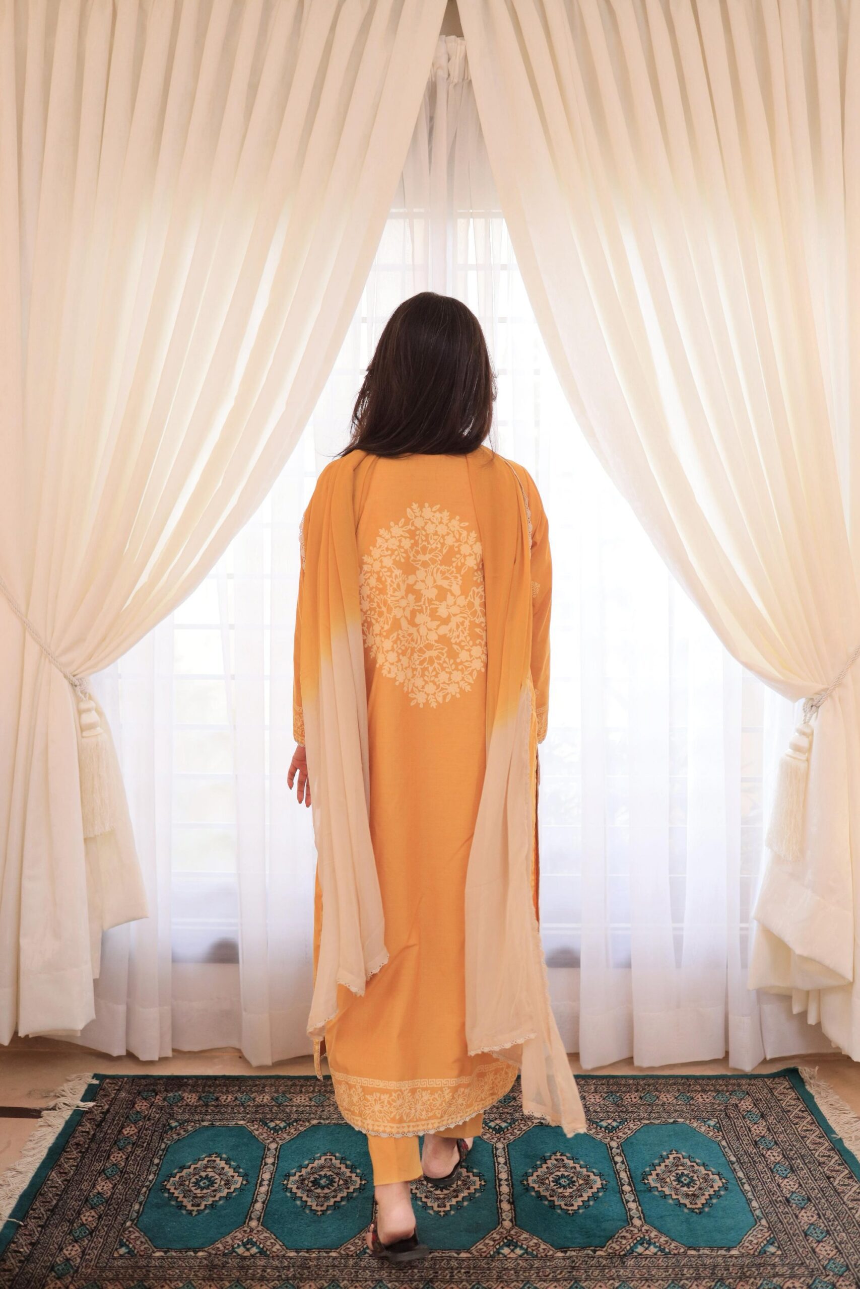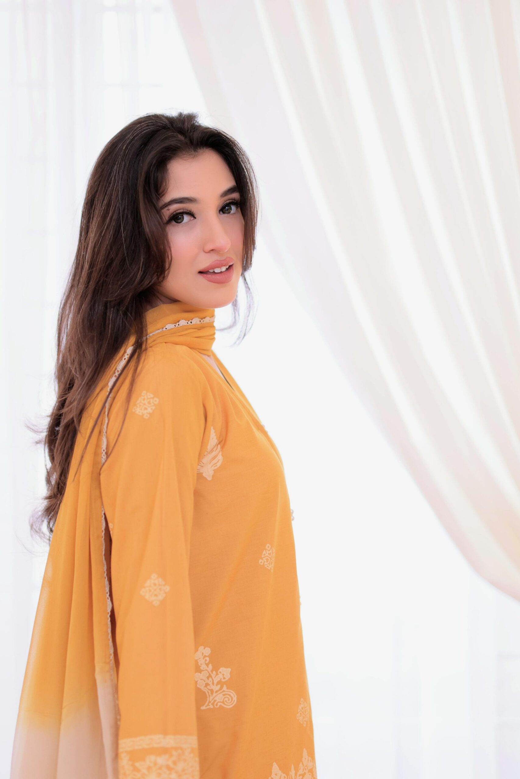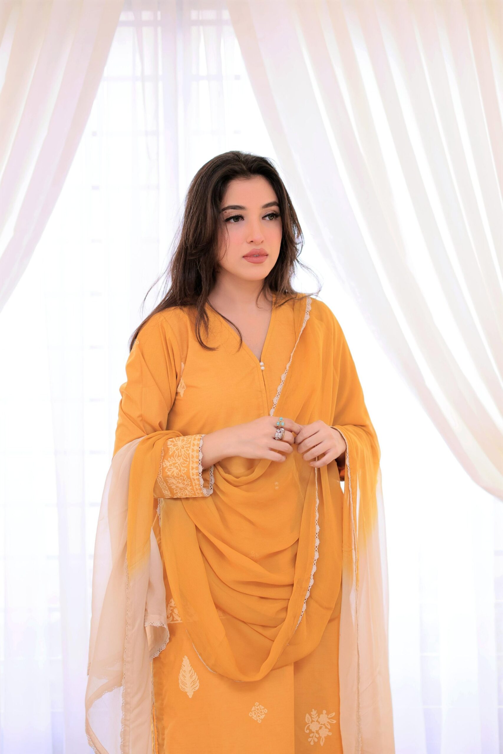 This mustard yellow lawn shirt features delicate white hand block-printed floral motifs and intricate border detailing. It is paired with a soft chiffon dupatta in an elegant mustard-to-ivory ombré gradient. A perfect blend of tradition and modern charm.