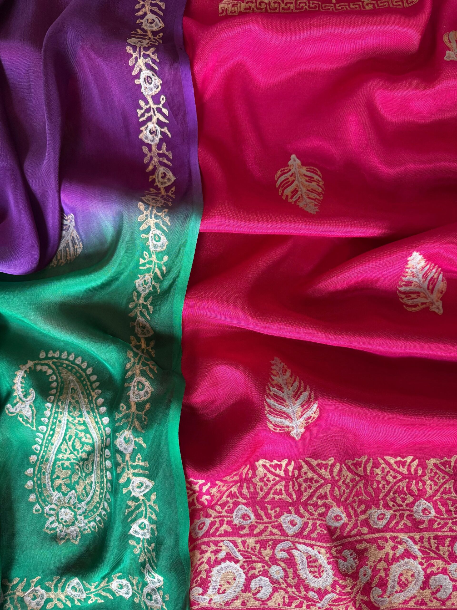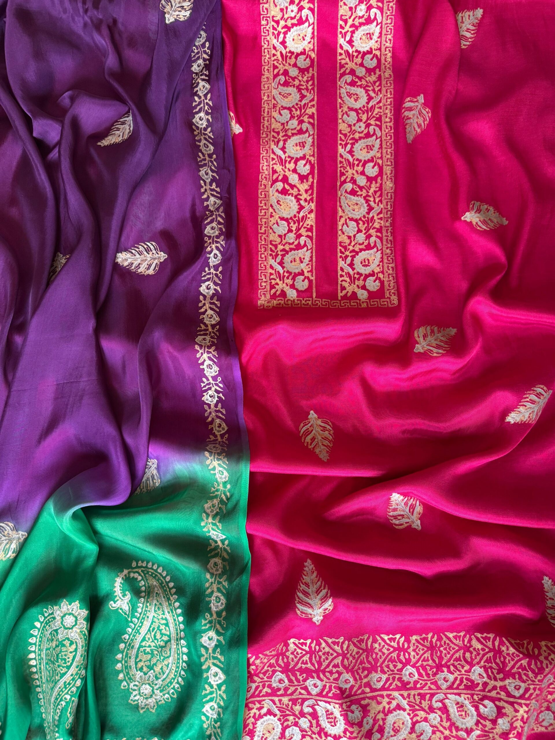 Unstitched 3-piece set comprising a beautifully gold and silver block-printed shirt in vivid pink, a two-toned dupatta in rich dark purple and green, and coordinated plain trousers.