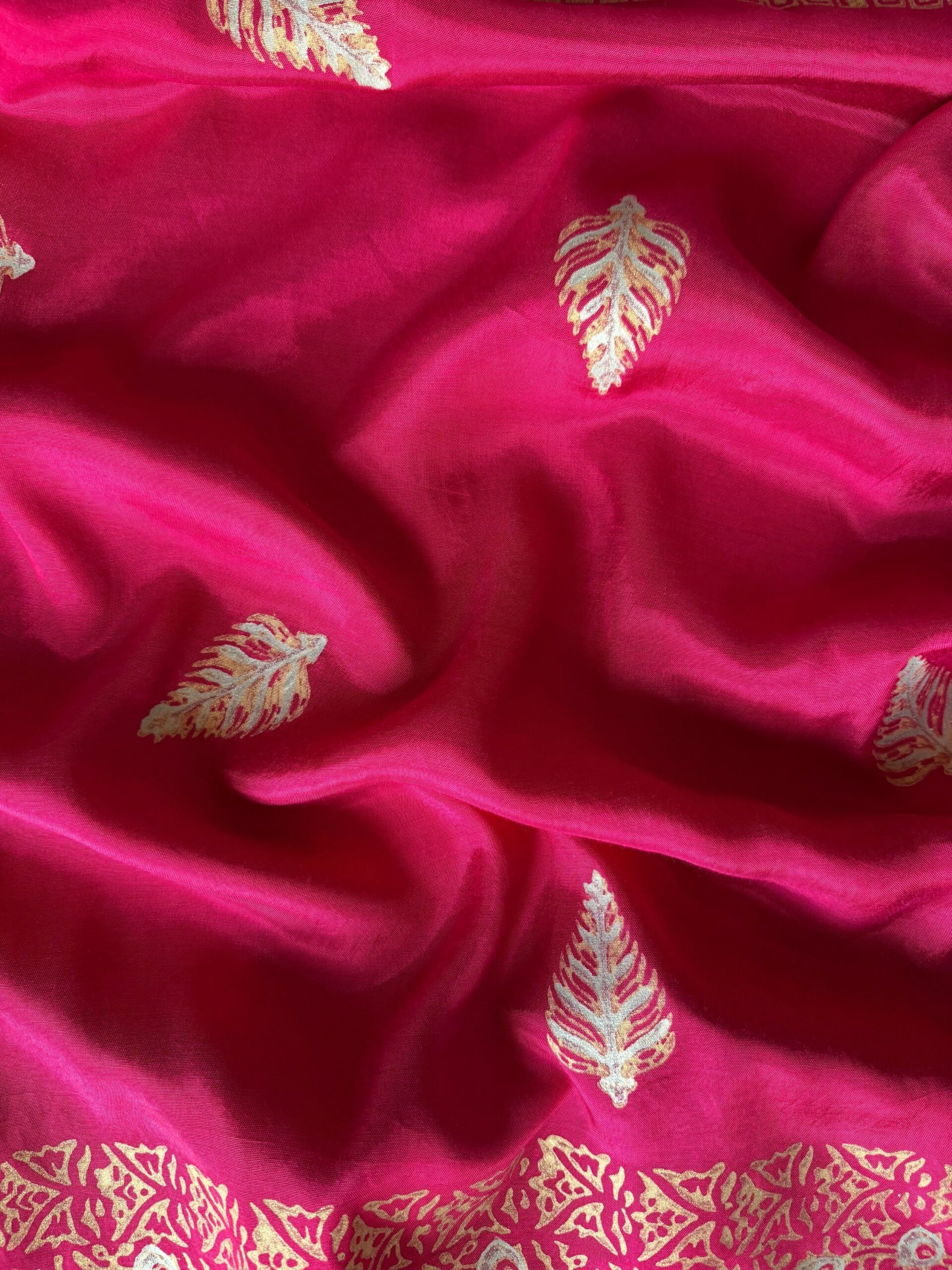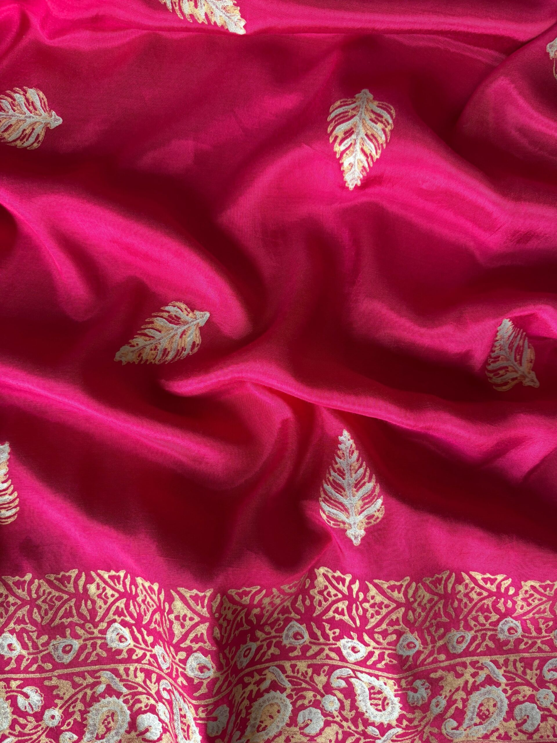 A striking vivid pink 3-piece ensemble that radiates elegance and timeless charm. Adorned with intricate gold and silver block prints.